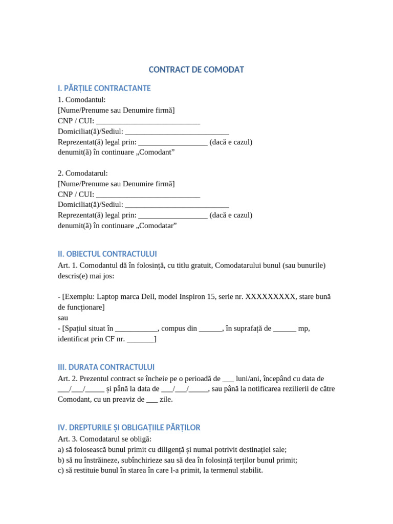 Art. 1. Comodantul dă în folosință, cu titlu gratuit, Comodatarului bunul (sau bunurile)
