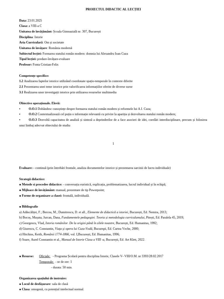 • O.O.1 Dobândesc cunoștințe despre formarea statului român modern și reformele lui A.I. Cuza;