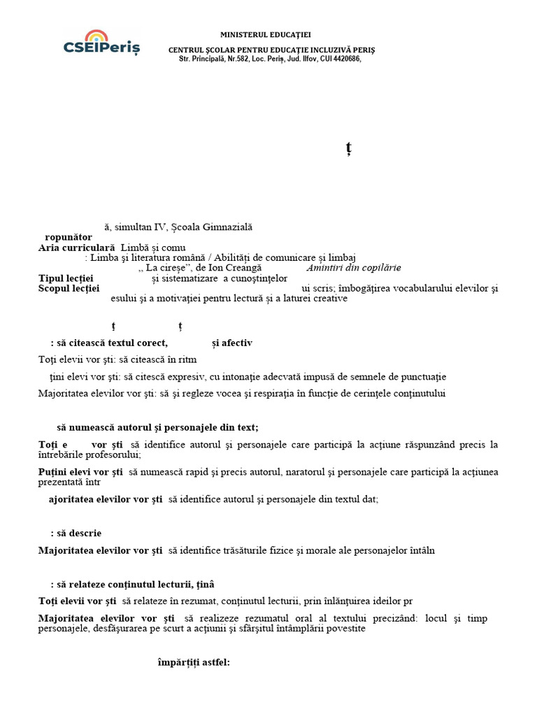 - Mijloace didactice: Manualul-Cartea Amintiri din copilărie de Ion Creangă (extras)