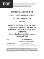 Obiectul parcului de producie energie regenerabila solara este de a transforma energia solara in energie electrica livrabila pentru utilizare prin sistemul naional de distributie a energiei solare spre consumatori. Ansamblul parcului de producie de regenerare a energiei solare in energie electrica se extinde pe o arie totala de 16.200 m2+1.192 m2=l 7.392 m2, suprafaa ocupata in ntregime de instalaiile cu panourile solare. Partea activa de captare a energiei solare si tranformarea ei in energie electrica se realizeaza cu maximum 4.240 bucati de panouri solare fotovoltaice cu puterea electrica a unui panou solar fotovoltaic cu care poate fi dotat acest proiect fiind de 230 Wp. Panourile solare sunt montate pe supori de constructie metalica fixa, pe 72 rnduri Rndurile sunt compuse in funcie de lungime, dintr-un numr total de 1.060 module a cate 4 buc. panouri solare/modul Distanta dintre rnduri este 4.70 m, stabilita pe baza metodologiei de determinarea distantei pentru evitarea acoperirii cu umbra a panourilor solare in tot timpul zilei, indiferent de poziia soarelui. Total puterea instalata al intregii suprafee acoperite de panouri solare este de 975 KWp Instalatia electrica [Link] si livrarea energiei electrice obtinute este formata in principal din: 1.8. cabluri electrice si dispozitive de conexiuni de legaturi intre panouri fotovoltaice, 1.9. 4..6 buc de invertoare de 200..250 W pentru tarnsformarea curentului continuua obtinut, in curent alternativ -statia de transformare pentru realizarea conexiunii de livrare a energiei electrice produsa in sistemul de distributie spre consumatori. Orientarea intregului amplasament de rnduri de panouri solare este de Est Vest Orientarea rndurilor de panou, respectiv unghiul azimutului fata de direcia Sud este 0 Unghiul de inclinare a panourilor fata de orizontala este 35. Tehnologia de transformare a energiei solara in energie electrica se bazeaza pe capacitatea celulelor fotovoltaice, din compoziia panourilor solare fotovoltaice, de a absorbi o parte din particulele de lumina a soarelui, numite fotoni, care conin o cantitate de energie. Cand fotonii sunt absorbii acetia elibereaza electroni din materialul celulelor [Link] solare fiind conectate intre ele, electronii eliberai trec prin coductori sub forma de curent, producnd electricitate ce poate fi folosita instantaneu sau inmagazinata in acumulatori. Structura construciei metalice pentru montaj si susinere a panourilor solare se realizeaza din profile laminate din otel. Subansamblurile de constructie metalica ale rndurilor,modulele sunt sustinute fiecare cu supori fixai in fundaii din beton armat turnat. ntreaga structura al ansamblului parcului fotovoltaic a fost dimensionata pe baza calculelor: -de rezistenta la presiunea vntului, 1.10. de rezistenta a structurii metalice la incarcari statice rezultata din greutatea proprie si din incarcarea cu zapada ce se depune iarna pe panourile solare in condiiile climatice din zona respectiva, -de dimensionarea pro filelor cu verificarea rezistentei acestora la ncovoiere, rezistenta picioarelor de susinere la flambaj etc. 4. ANALIZA AMBIENTALA A MEDIULUI La determinarea eficientei sistemelor energetice, un factor care se ia in calcul este emisiunea de C02 de la diferite sisteme energetice care afecteaza negativ mediul ambiental. Ca urmare se procedeaza la determinarea emisiunii de C02 produse de sistemele energetice.