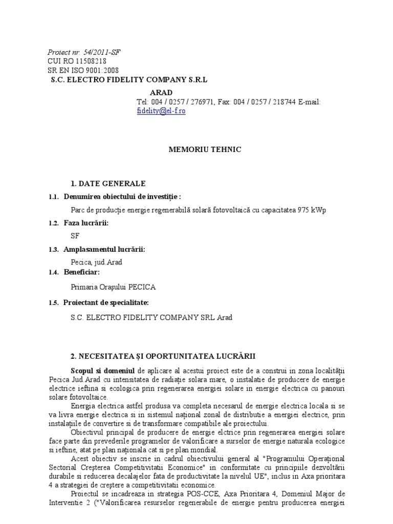 2. NECESITATEA I OPORTUNITATEA LUCRRII Scopul si domeniul de aplicare al acestui proiect este de a construi in zona localitii Pecica [Link] cu intensitatea de radiaie solara mare, o instalatie de producere de energie electrice ieftina si ecologica prin regenerarea energiei solare in energie electrica cu panouri solare fotovoltaice. Energia electrica astfel produsa va completa necesarul de energie electrica locala si se va livra energie electrica si in sistemul naional zonal de distributie a energiei electrice, prin instalaiile de convertire si de transformare compatibile ale proiectului. Obiectivul principal de producere de energie elctrice prin regenerarea energiei solare face parte din prevederile programelor de valorificare a surselor de energie naturala ecologice si ieftine, atat pe plan naionala cat si pe plan mondial. Acest obiectiv se inscrie in cadrul obiectivului general al "Programului Operaional Sectorial Creterea Competitivitatii Economice" in conformitate cu principiile dezvoltrii durabile si reducerea decalajelor fata de productivitate la nivelul UE", inclus in Axa prioritara 4 a strategiei de cretere a competitivitatii economice. Proiectul se incadreaza in strategia POS-CCE, Axa Prioritara 4, Domeniul Major de Interventie 2 ("Valorificarea resurselor regenerabile de energie pentru producerea energiei