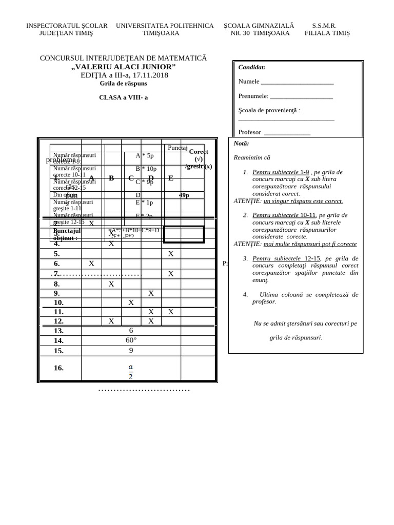 Număr răspusuri F * 2p 2. Pentru subiectele 10-11, pe grila de