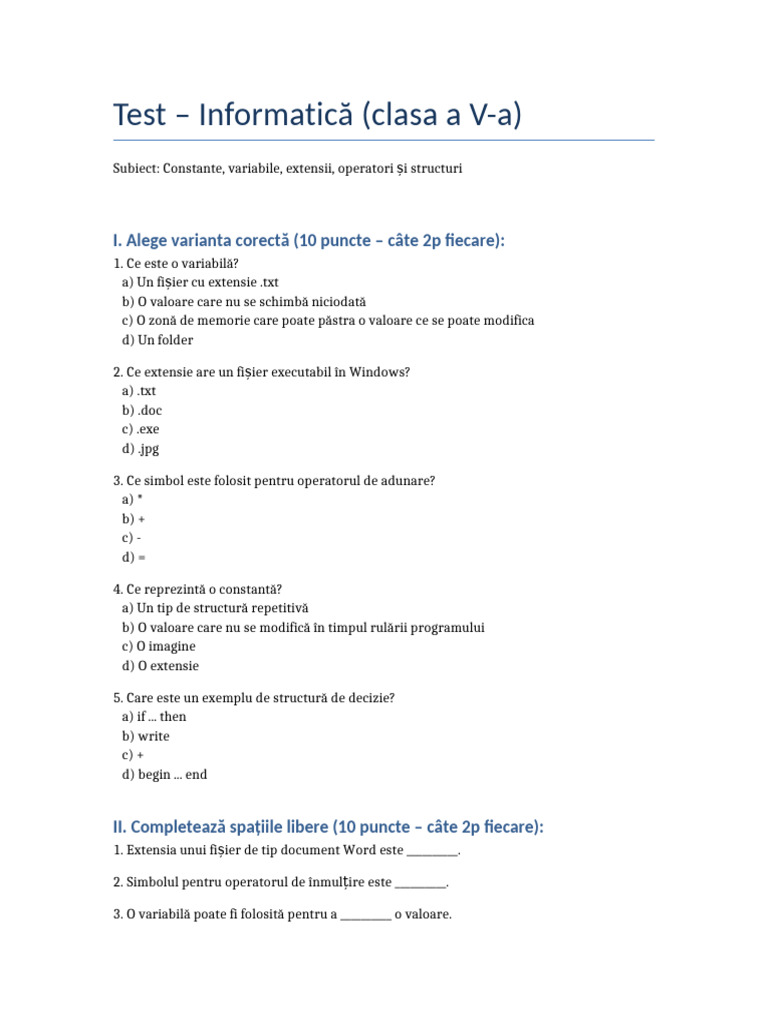 Subiect: Constante, variabile, extensii, operatori și structuri