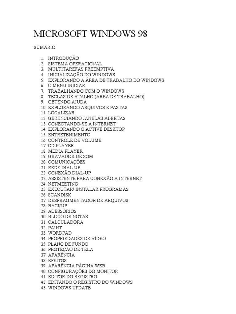 SUMRIO 1. INTRODUO 2. SISTEMA OPERACIONAL 3. MULTITAREFAS PREEMPTIVA 4. INICIALIZAO DO WINDOWS 5. EXPLORANDO A REA DE TRABALHO DO WINDOWS 6. O MENU INICIAR 7. TRABALHANDO COM O WINDOWS 8. TECLAS DE ATALHO (REA DE TRABALHO) 9. OBTENDO AJUDA 10. EXPLORANDO ARQUIVOS E PASTAS 11. LOCALIZAR 12. GERENCIANDO JANELAS ABERTAS 13. CONECTANDO-SE INTERNET 14. EXPLORANDO O ACTIVE DESKTOP 15. ENTRETENIMENTO 16. CONTROLE DE VOLUME 17. CD PLAYER 18. MEDIA PLAYER 19. GRAVADOR DE SOM 20. COMUNICAES 21. REDE DIAL-UP 22. CONEXO DIAL-UP 23. ASSISTENTE PARA CONEXO A INTERNET 24. NETMEETING 25. EXECUTAR/ INSTALAR PROGRAMAS 26. SCANDISK 27. DESFRAGMENTADOR DE ARQUIVOS 28. BACKUP 29. ACESSRIOS 30. BLOCO DE NOTAS 31. CALCULADORA 32. PAINT 33. WORDPAD 34. PROPRIEDADES DE VDEO 35. PLANO DE FUNDO 36. PROTEO DE TELA 37. APARNCIA 38. EFEITOS 39. APARNCIA PGINA WEB 40. CONFIGURAES DO MONITOR 41. EDITOR DO REGISTRO 42. EDITANDO O REGISTRO DO WINDOWS 43. WINDOWS UPDATE