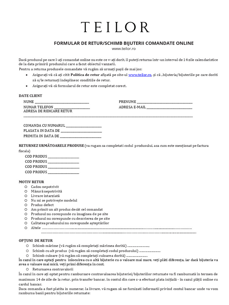 FORMULAR DE RETUR/SCHIMB BIJUTERII COMANDATE ONLINE