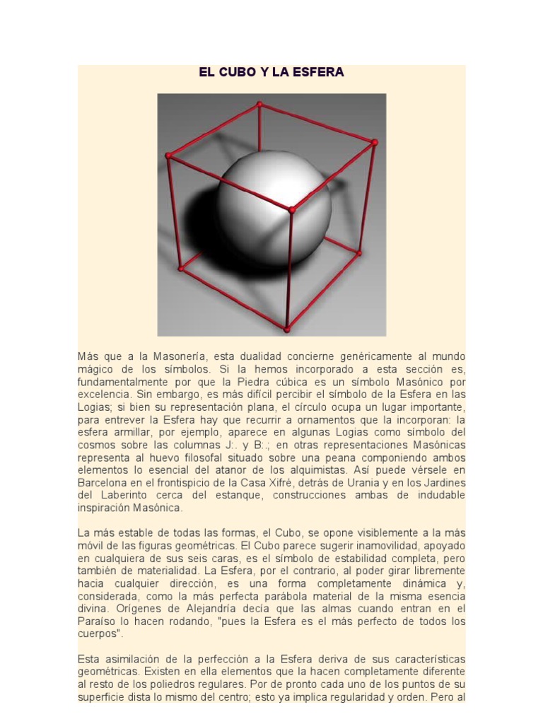 Ms que a la Masonera, esta dualidad concierne genricamente al mundo mgico de los smbolos. Si la hemos incorporado a esta seccin es, fundamentalmente por que la Piedra cbica es un smbolo Masnico por excelencia. Sin embargo, es ms difcil percibir el smbolo de la Esfera en las Logias; si bien su representacin plana, el crculo ocupa un lugar importante, para entrever la Esfera hay que recurrir a ornamentos que la incorporan: la esfera armillar, por ejemplo, aparece en algunas Logias como smbolo del cosmos sobre las columnas J:. y B:.; en otras representaciones Masnicas representa al huevo filosofal situado sobre una peana componiendo ambos elementos lo esencial del atanor de los alquimistas. As puede vrsele en Barcelona en el frontispicio de la Casa Xifr, detrs de Urania y en los Jardines del Laberinto cerca del estanque, construcciones ambas de indudable inspiracin Masnica. La ms estable de todas las formas, el Cubo, se opone visiblemente a la ms mvil de las figuras geomtricas. El Cubo parece sugerir inamovilidad, apoyado en cualquiera de sus seis caras, es el smbolo de estabilidad completa, pero tambin de materialidad. La Esfera, por el contrario, al poder girar libremente hacia cualquier direccin, es una forma completamente dinmica y, considerada, como la ms perfecta parbola material de la misma esencia divina. Orgenes de Alejandra deca que las almas cuando entran en el Paraso lo hacen rodando, "pues la Esfera es el ms perfecto de todos los cuerpos". Esta asimilacin de la perfeccin a la Esfera deriva de sus caractersticas geomtricas. Existen en ella elementos que la hacen completamente diferente al resto de los poliedros regulares. Por de pronto cada uno de los puntos de su superficie dista lo mismo del centro; esto ya implica regularidad y orden. Pero al