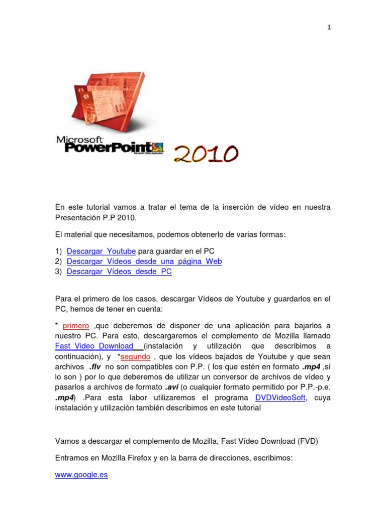En este tutorial vamos a tratar el tema de la insercin de vdeo en nuestra Presentacin P.P 2010. El material que necesitamos, podemos obtenerlo de varias formas: 1) Descargar_Youtube para guardar en el PC 2) Descargar_Vdeos_desde_una_pgina_Web 3) Descargar_Vdeos_desde_PC