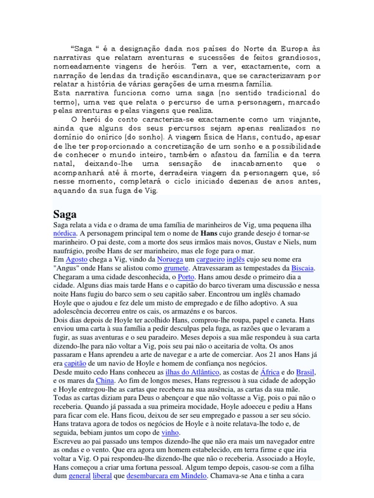 te viagens de heris. Tem a ver, exactamente, com a narrao de lendas da tradio escandinava, que se caracterizavam por relatar a histria de vrias geraes de uma mesma famlia. Esta narrativa funciona como uma saga (no sentido tradicional do termo), uma vez que relata o percurso de uma personagem, marcado pelas aventuras e pelas viagens que realiza. O heri do conto caracteriza-se exactamente como um viajante, ainda que alguns dos seus percursos sejam apenas realizados no domnio do onrico (do sonho). A viagem fsica de Hans, contudo, apesar de lhe ter proporcionado a concretizao de um sonho e a possibilidade de conhecer o mundo inteiro, tambm o afastou da famlia e da terra natal, deixando-lhe uma sensao de inacabamento que o acompanhar at morte, derradeira viagem da personagem que, s nesse momento, completar o ciclo iniciado dezenas de anos antes, aquando da sua fuga de Vig.