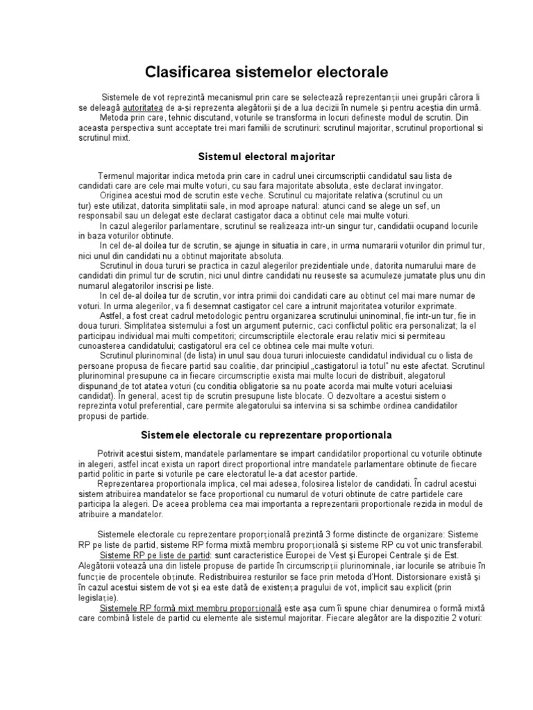 Potrivit acestui sistem, mandatele parlamentare se impart candidatilor proportional cu voturile obtinute in alegeri, astfel incat exista un raport direct proportional intre mandatele parlamentare obtinute de fiecare partid politic in parte si voturile pe care electoratul le-a dat acestor partide. Reprezentarea proportionala implica, cel mai adesea, folosirea listelor de candidati. n cadrul acestui sistem atribuirea mandatelor se face proportional cu numarul de voturi obtinute de catre partidele care participa la alegeri. De aceea problema cea mai importanta a reprezentarii proportionale rezida in modul de atribuire a mandatelor. Sistemele electorale cu reprezentare proporional prezint 3 forme distincte de organizare: Sisteme RP pe liste de partid, sisteme RP forma mixt membru proporional i sisteme RP cu vot unic transferabil. Sisteme RP pe liste de partid: sunt caracteristice Europei de Vest i Europei Centrale i de Est. Alegtorii voteaz una din listele propuse de partide n circumscripii plurinominale, iar locurile se atribuie n funcie de procentele obinute. Redistribuirea resturilor se face prin metoda dHont. Distorsionare exist i n cazul acestui sistem de vot i ea este dat de existena pragului de vot, implicit sau explicit (prin legislaie). Sistemele RP form mixt membru proporional este aa cum i spune chiar denumirea o form mixt care combin listele de partid cu elemente ale sistemul majoritar. Fiecare alegtor are la dispozitie 2 voturi: