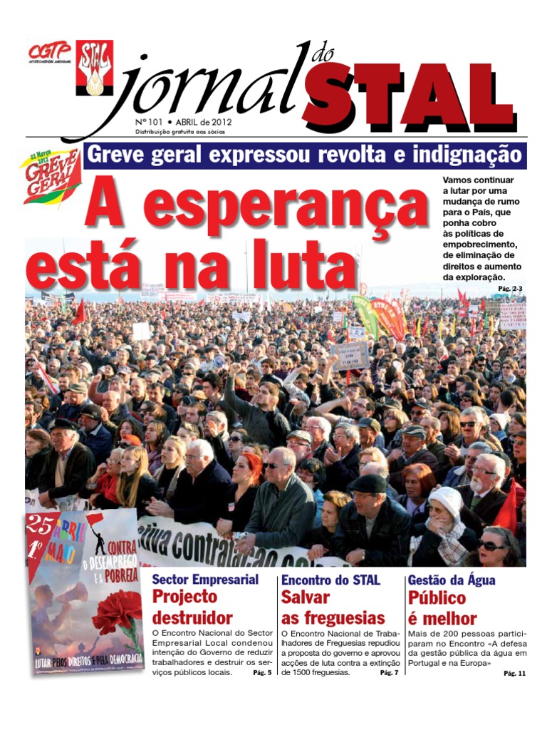 No primeiro trimestre de 2012, trabalhadores, dirigentes, delegados e activistas sindicais da Administrao Local participaram numa srie de importantes aces de protesto e de luta, aos mais variados nveis, quer no mbito da Frente Comum da Administrao Pblica, quer em jornadas nacionais convocadas pela CGTP-IN. Em 18 de Janeiro, dezenas de activistas sindicais concentraram-se na Assembleia da Repblica, onde entregaram centenas de pareceres aprovados em plenrios de trabalhadores contra a proposta de lei n. 36/XII, atravs da qual o governo pretendia impor o aumento dos horrios de trabalho. Em 23 de Fevereiro, dirigentes dos principais sindicatos da Administrao Pblica concentraram-se junto ao Edifcio Jean Monet, em Lisboa, no mbito de uma aco de luta a nvel europeu, promovida pela Unio Internacional de Sindicatos de Servios Pblicos e Similares (UIS-SP-S), estrutura que integra a Federao Sindical Mundial (FSM). Em 24 de Fevereiro, dirigentes e delegados sindicais do STAL assistiram nas galerias da Assembleia da Repblica ao debate da petio em defesa do Poder Local, contra a reduo de trabalhadores e de autarquias, que recolheu mais de 32 mil assinaturas. Em 29 de Fevereiro, milhares de trabalhadores e activistas sindicais participaram em concentraes em todo o pas no mbito de uma jornada europeia de luta. Em 1 de Maro, os trabalhadores do Municpio de Setbal, aps um plenrio, desfilaram pela cidade, em protesto contra as ingerncias da IGAL (que se verificam tambm noutras autarquias), com vista a anular as mudanas de posicionamento remuneratrio por opo gestionria. Em 2 de Maro, aps um plenrio nacional da Frente Comum, centenas de activistas sindicais da Administrao Pblica concentraram-se frente ao Ministrio das Finanas, repudiando os cortes nos subsdios de frias e de Natal, a reduo e o congelamento dos salrios, a mobilidade forada e o acordo assinado pela UGT, que prev a adaptabilidade e a criao do banco de horas. Em 8 de Maro, o Dia Internacional da Mulher foi assinalado em diversos pontos do pas com vrias iniciativas. Em Lisboa, foi apresentada uma pequena pea teatral sobre a luta secular das mulheres pela sua emancipao. A iniciativa, que contou com a participao de activistas sindicais da Direco Regional de Lisboa do STAL, foi promovida pela Unio dos Sindicatos de Lisboa, a Inter-Reformados, a Interjovem, a CGTP-IN e o Movimento Democrtico de Mulheres. Em 11 de Maro, mais de 300 mil trabalhadores deram corpo a uma poderosa manifestao da CGTP-IN, em Lisboa, transformando o Terreiro do Pao num autntico Terreiro do Povo. No dia 20 de Maro, uma delegao de dirigentes nacionais do STAL deslocou-se residncia oficial do primeiro-ministro, onde entregou um memorando sobre os problemas dos trabalhadores da Administrao Local e Regional. J depois do fecho desta edio, estava convocada para 31 de Maro uma manifestao contra a extino de freguesias, com a qual o STAL se solidarizou, apelando aos trabalhadores para participarem nesta jornada em defesa dos seus direitos e postos de trabalho. Para o mesmo dia, a Interjovem/CGTP-IN marcou manifestao nacional de jovens trabalhadores.