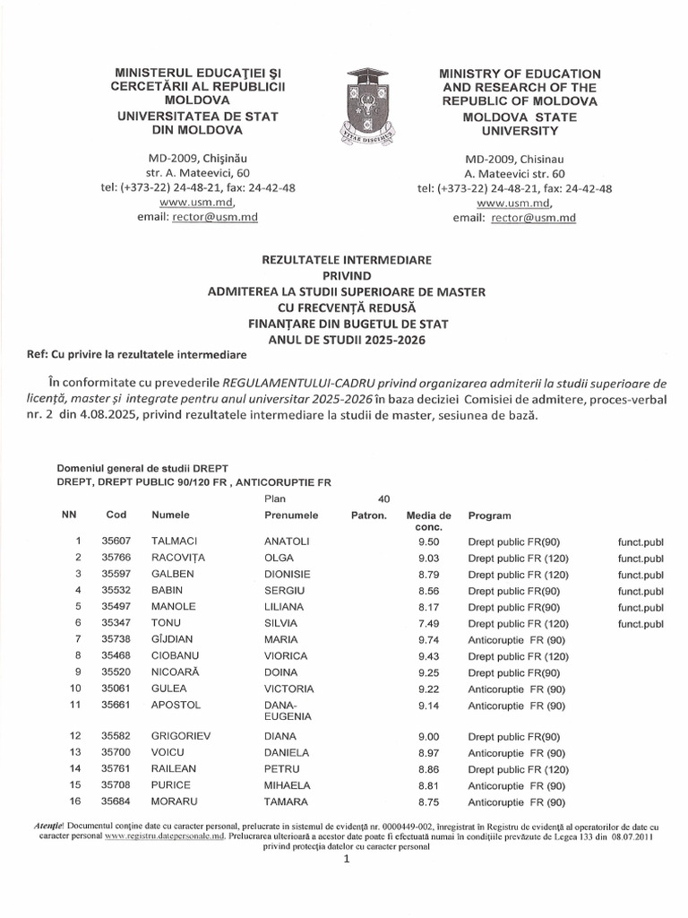 nr. 2 din 4.08.2025, privind rezultatele intermediare la studii de master, sesiunea de bază.