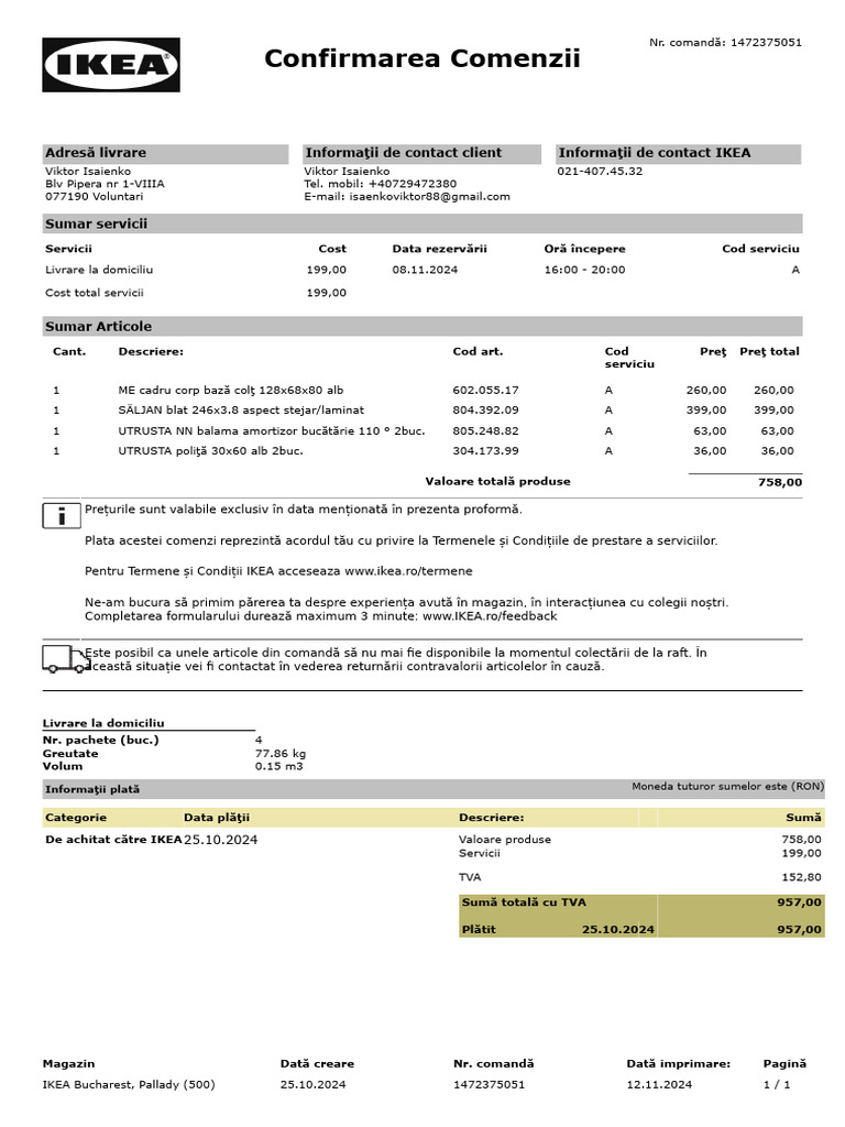 IKEA Bucharest, Pallady (500) 25.10.2024 1472375051 12.11.2024 1/1