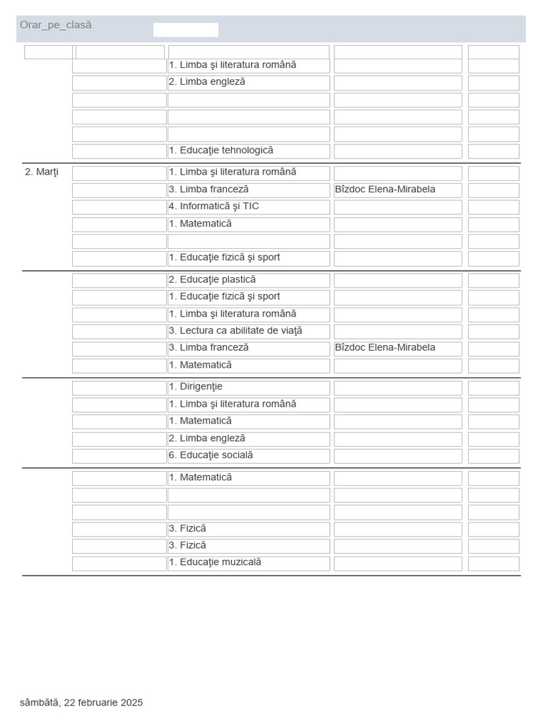 2. Marţi 08:00-08:50 1. Limba şi literatura română Neagu Lavinia-Filofteia 215