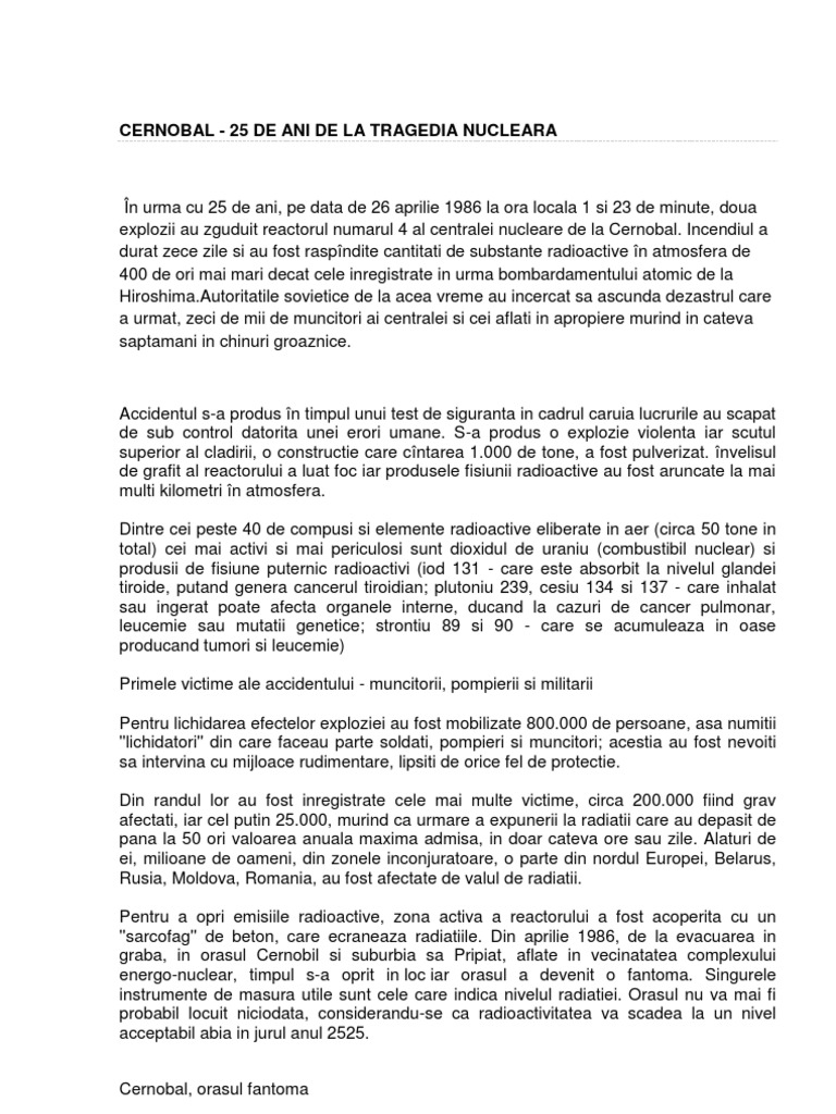 n urma cu 25 de ani, pe data de 26 aprilie 1986 la ora locala 1 si 23 de minute, doua explozii au zguduit reactorul numarul 4 al centralei nucleare de la Cernobal. Incendiul a durat zece zile si au fost raspndite cantitati de substante radioactive n atmosfera de 400 de ori mai mari decat cele inregistrate in urma bombardamentului atomic de la [Link] sovietice de la acea vreme au incercat sa ascunda dezastrul care a urmat, zeci de mii de muncitori ai centralei si cei aflati in apropiere murind in cateva saptamani in chinuri groaznice.