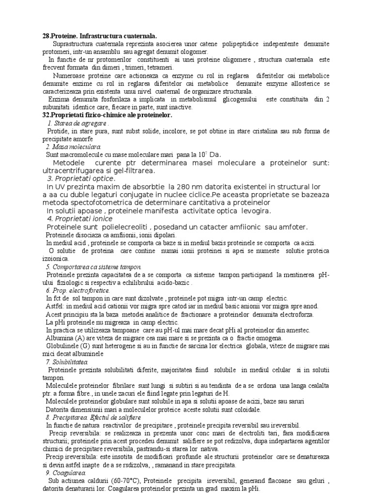 Suprastructura cuaternala reprezinta asocierea unor catene polipeptidice indepentente denumite protomeri, intr-un ansamblu sau agregat denumit ologomer. In functie de nr protomerilor constituenti ai unei proteine oligomere , structura cuaternala este frecvent formata din dimeri , trimeri, tetrameri. Numeroase proteine care actioneaza ca enzyme cu rol in reglarea diferitelor cai metabolice denumite enzime cu rol in reglarea diferitelor cai metabolice denumite enzyme allosterice se caracterizeaza prin existenta unui nivel cuaternal de organizare structurala. Enzima denumita fosforilaza a implicata in metabolismul glicogenului este constituita din 2 subunitati identice care, fiecare in parte, sunt inactive. 32.Proprietati fizico-chimice ale proteinelor. 1. Starea de agregare . Protide, in stare pura, sunt subst solide, incolore, se pot obtine in stare cristalina sau sub forma de precipitate amorfe 2. Masa moleculara. Sunt macromolecule cu mase moleculare mari pana la 10 Da. Metodele curente ptr determinarea masei moleculare a proteinelor sunt: ultracentrifugarea si gel-filtrarea. 3. Proprietati optice. In UV prezinta maxim de absorbtie la 280 nm datorita existentei in structural lor a aa cu duble legaturi conjugate in nuclee ciclice.Pe aceasta proprietate se bazeaza metoda spectofotometrica de determinare cantitativa a proteinelor In solutii apoase , proteinele manifesta activitate optica levogira. 4. Proprietati ionice Proteinele sunt polielecreoliti , posedand un catacter amfiionic sau amfoter. Proteinele disociaza ca amfiionii, ionii dipolari. In mediul acid , proteinele se comporta ca baze si in mediul bazis proteinele se comporta ca acizi. O solutie de proteina care contine numai ionii proteinei si apei se numeste solutie proteica izoionica. 5. Comportarea ca sisteme tampon. Proteinele prezinta capacitatea de a se comporta ca sisteme tampon participand la mentinerea pHului fiziologic si respectiv a echilibrului acido-bazic . 6. Prop. electroforetice. In fct de sol tampon in care sunt dizolvate , proteinele pot migra intr-un camp electric. Astfel: in mediul acid cationii vor migra spre catod iar in mediul basic anionii vor migra spre anod. Acest principiu sta la baza metodei analitice de fractionare a proteinelor denumita electroforza. La pHi proteinele nu migreaza in camp electric. In practica se utilizeaza tampoane care au pH-ul mai mare decat pHi al proteinelor din amestec. Albumina (A) are viteza de migrare cea mai mare si se prezinta ca o fractie omogena. Globulinele (G) sunt heterogene si au in functie de sarcina lor electrica globala, viteze de migrare mai mici decat albuminele 7. Solubilitatea. Proteinele prezinta solubilitati diferite, majoritatea fiind solubile in mediul celular si in solutii tampon. Moleculele proteinelor fibrilare sunt lungi si subtiri si au tendinta de a se ordona una langa cealalta ptr. a forma fibre., in unele zacuri ele fiind legate prin legaturi de H. Moleculele proteinelor globulare sunt solubile in apa si solutii apoase de acizi, baze sau saruri Datorita dimensiunii mari a moleculelor proteice aceste solutii sunt coloidale. 8. Precipitarea. Efectul de salifiere In functie de natura reactivilor de precipitare , proteinele precipita reversibil sau ireversibil. Precip reversibila: se realizeaza in prezenta unor conc mari de electroliti tari, fara modificarea structurii; proteinele prin acest procedeu denumit salifiere se pot redizolva, dupa indepartarea agentilor chimici de precipitare reversibila, pastrandu-si starea lor nativa. Precip ireversibila: este insotita de modificari profunde ale structurii proteinelor care se denatureaza si devin astfel inapte de a se rsdizolva, , ramanand in stare precipitata. 9. Coagularea. Sub actiunea caldurii (60-70C), Proteinele precipita ireversibil, generand flacoane sau geluri , datorita denaturarii lor. Coagularea proteinelor prezinta un grad maxim la pHi.