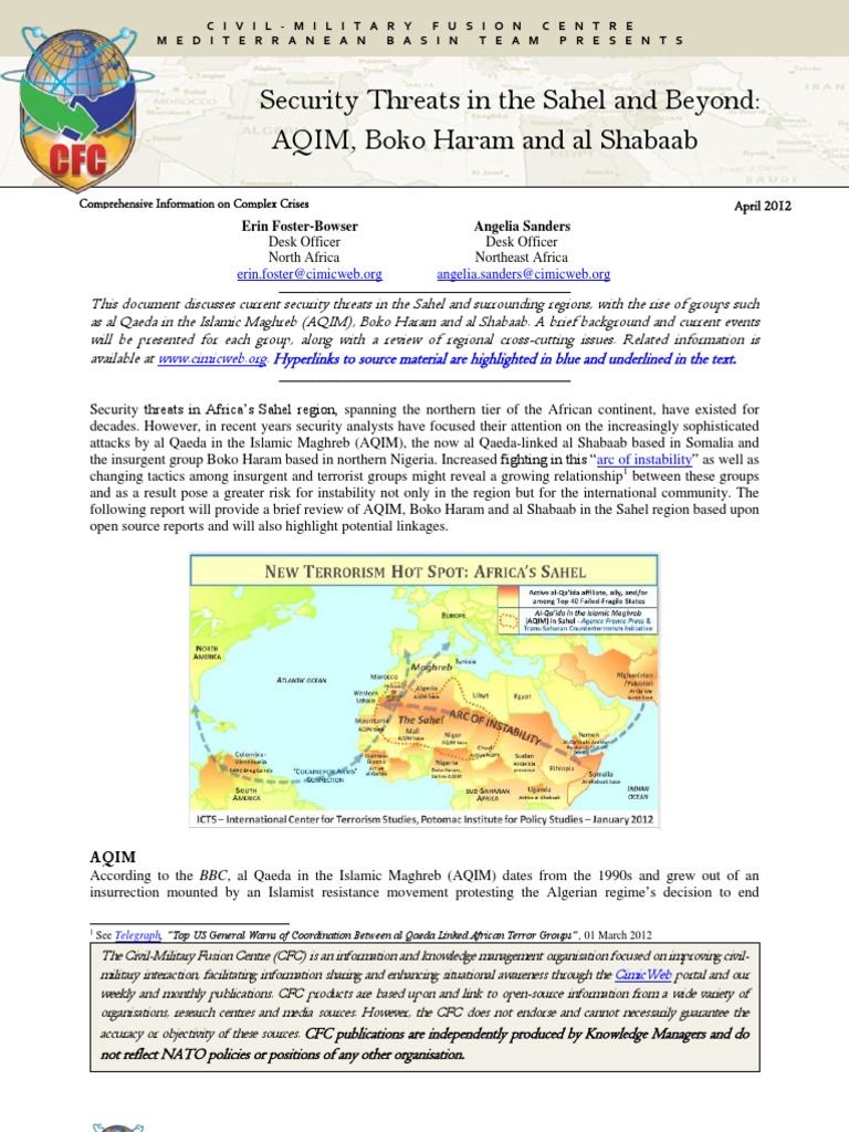 This document discusses current security threats in the Sahel and surrounding regions, with the rise of groups such as al Qaeda in the Islamic Maghreb (AQIM), Boko Haram and al Shabaab. A brief background and current events will be presented for each group, along with a review of regional cross-cutting issues. Related information is available at www.cimicweb.org. Hyperlinks to source material are highlighted in blue and underlined in the text.