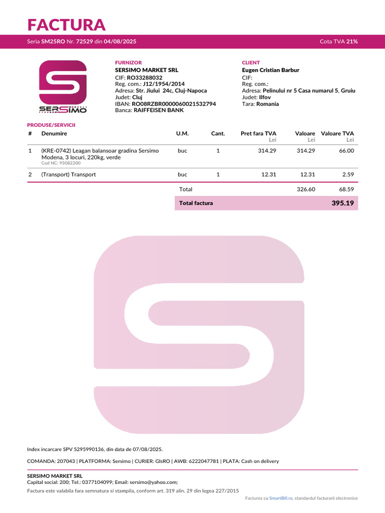 COMANDA: 207043 | PLATFORMA: Sersimo | CURIER: GlsRO | AWB: 6222047781 | PLATA: Cash on delivery