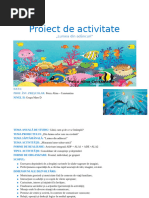 poluata. Educatoarea invit copiii s formeze un cerc i n cadrul Activitii de grup se recit mpreun urmtoarea poezie, fcnd i gesturile potrvite fiecrui vers: ,,In fiecare diminea s-avem gndul bun pe fa (copiii i terg faa cu palmele) Ctre soare s privim (minile deasupra capului, privirea sus) Iubire s druim.(minile la piept, apoi n fa) De gnd ru s ne ferim (alungm cu o mn) S-adunm doar bucurie (aducem minile la piept) i-n lume s-o rspndim(minile n fa) i-atunci, oriice copil, n fiecare diminea, Are gndul bun pe fa! (artm spre fiecare copil din grup) Gimnastica de nviorare se va desfura efectund cteva micri cunoscute, precum i jocul Broatele sar n lac (Hai, broscuelor, pornii,/i n balt s srii!) , n cadrul cruia copiii vor avea posibilitatea de a-i alege echipa n care vor lucra, cu ajutorul unor ecusoane (albastre peti, verzi broscue). Dupa activitatea de grup educatorea prezinta copiiilor sticla cu mesajul de la Pestisorul de Aur care le cere copiiilor sa desfasoare un joc pentru a reda buna dispozitie a pestilor dim mare afectati de poluare. Astzi, dragi copii, mpreun o s mergem n - Marea aventur n salvarea petilor . n aceast aventura o sa ne jucam, scriem, decupam, pictam, vom realiza puzzle, o sa numaram, o sa forman grupe de obiecte. Dar ca s putem porni n marea aventur, trebuie mai nti s facem anumite lucruri, i astfel copiii sunt invitai spre centrele de interes prin intermediul versurilor (tranzitie) Din Oceanul Pacific / A iesit un peste mic/ Si pe coada lui scria/ Hai la [Link] mai sta! La Bibliotec copiii vor scrie lunia curb, Solzi de pete; La Jocul de mas ali copii vor realiza puzzle-uri din povetile Mica siren i Nemo. La Art copiii vor decupa pestisori si vor picta forme de ipsos; La Joc de rol La pescuit. Dupa finalizarea lucrarilor pe centre, copiii vor parasi sala de grupa pe versurile cantecului (tranzitie) Brascuta Oachiiar la revenirea in sala a copiiilor se trece la derularea activitatilor din cadrul domeniiilor experentiale. Astfel, in activitatea de astazi sunt integrate Domeniul stiinte matematica, Domeniul limba si comunicare si Domeniul psihomotric, urmarindu-se atingerea obiectivelor specifice dar si buna dispozitie a copiiilor. Ca prima sarcina a jocului se propune jocul:La [Link] pentru echipaalbastra: sa mearga 8 pasi, pe farfuri de la linia de pornire si sa pescuiasca al 6-lea peste asezat pe lac, sarcina pentru echipa verde :sa mearga 7pasi, pe calcaie si sa pescuiasca al 4 lea peste asezat pe lac. [Link] pentru echuipa albastra : sa alerge pana la lac si sa pescuiasca 5 pesti mari, echipa verde : sa alerge pana la lac si sa pescuiasca 6 pesti mici.