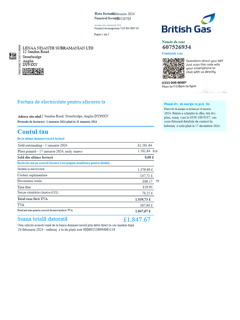 1 Ianuarie 2024 până la 31 Ianuarie 2024 9.239,51 kWh la 0,847 p 78,25 £