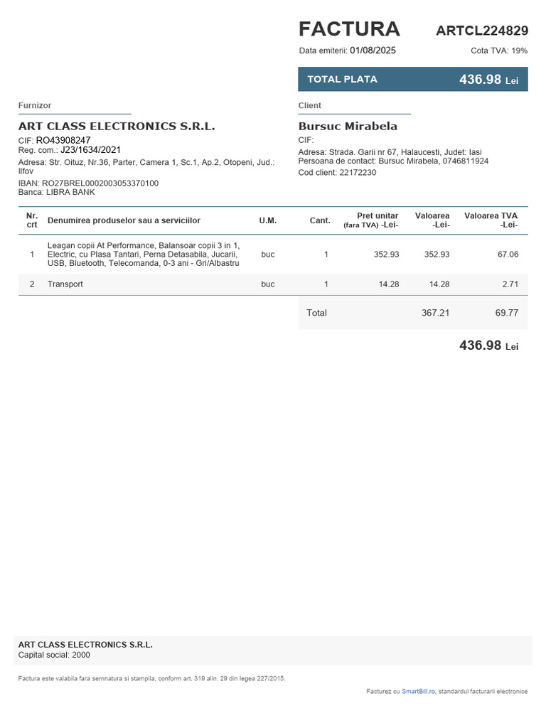 Data emiterii: 01/08/2025 Cota TVA: 19%
