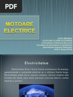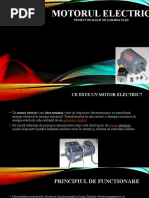 Motoarele electrice cu curent continuu In general, sunt similare in constructie cu generatoarele de curent continuu Ele pot, de fapt sa fie descrise ca generatoare care functioneaza invers Cand curentul trece prin rotorul unui motorelectric , e generat un camp magnetic care genereaza o forta electromagnetica, si ca rezultat rotorul se rote Actiunea periilor colectoare si a placutelor colectoare e exact aceiasi ca la generator Rotatia rotorului induce un voltaj in bobinajul rotorului Acest voltaj indus are sens opus voltajului exterior aplicat rotorului In timp ce motorul electric se rote mai rapid, voltajul rezultat e aproape egal cu cel indus Curentul e mic, si viteza motorului electric va ramane constanta atat timp cat asupra motorului electric nu actioneaza nici o sarcina, sau motorul nu efectueaza alt lucru mecanic decat cel efectuat pt invartirea rotorului Cand asupra rotorului se aplica o sarcina, voltajul va fi redus si un curent mai mare va putea sa treaca prin rotor Astfel, motorul electric e capabil sa primeasca mai mult curent de la sursa care il alimenteaza, si astfel sa efectueze mai mult lucru mecanic