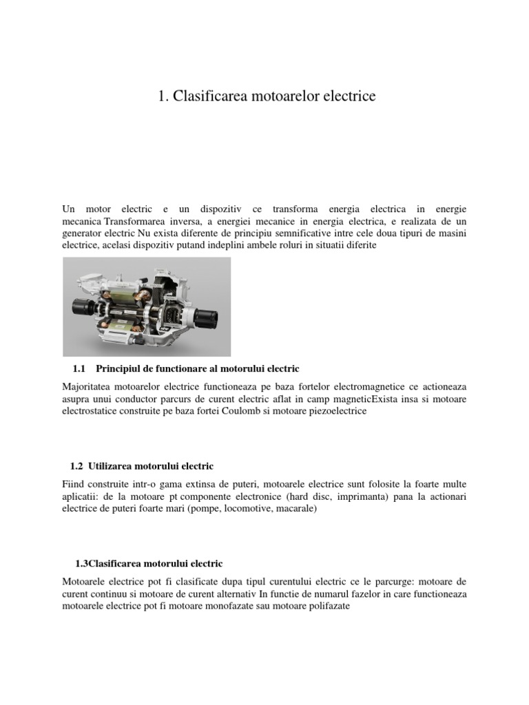 1.3Clasificarea motorului electric Motoarele electrice pot fi clasificate dupa tipul curentului electric ce le parcurge: motoare de curent continuu si motoare de curent alternativ In functie de numarul fazelor in care functioneaza motoarele electrice pot fi motoare monofazate sau motoare polifazate