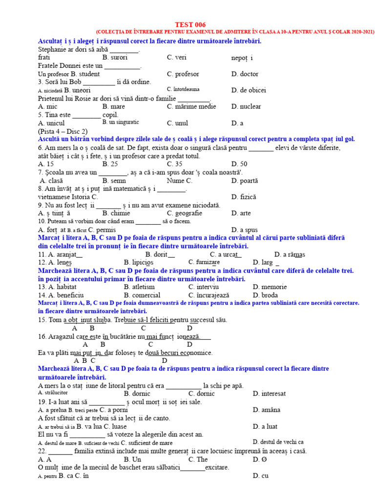 Marcaț i litera A, B, C sau D pe foaia de răspuns pentru a indica răspunsul corect la fiecare dintre