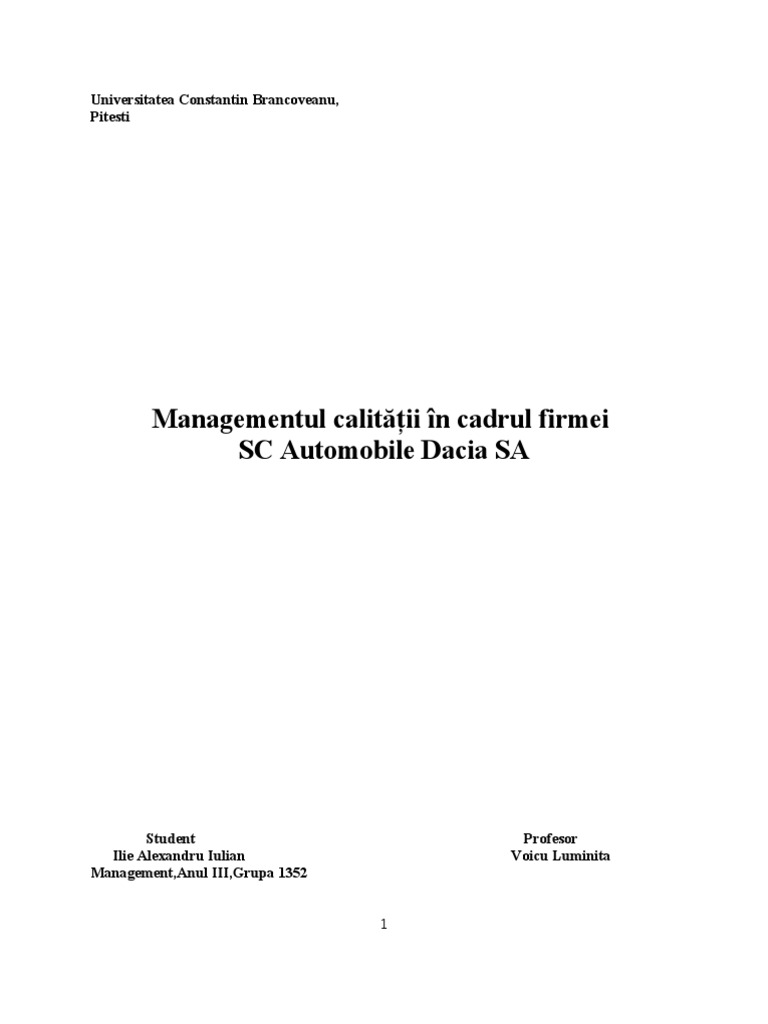 CUPRINS Generalitati.3 Implementarea sistemului calittii....5 Prezentarea firmei11 Manualul Calitatii in cadrul firmei SC Automobile Dacia SA31 Resurse umane in cadrul firmei SC Automobile Dacia SA..59 Analiza SWOT..60 Concluzii....61 Bibliografie62