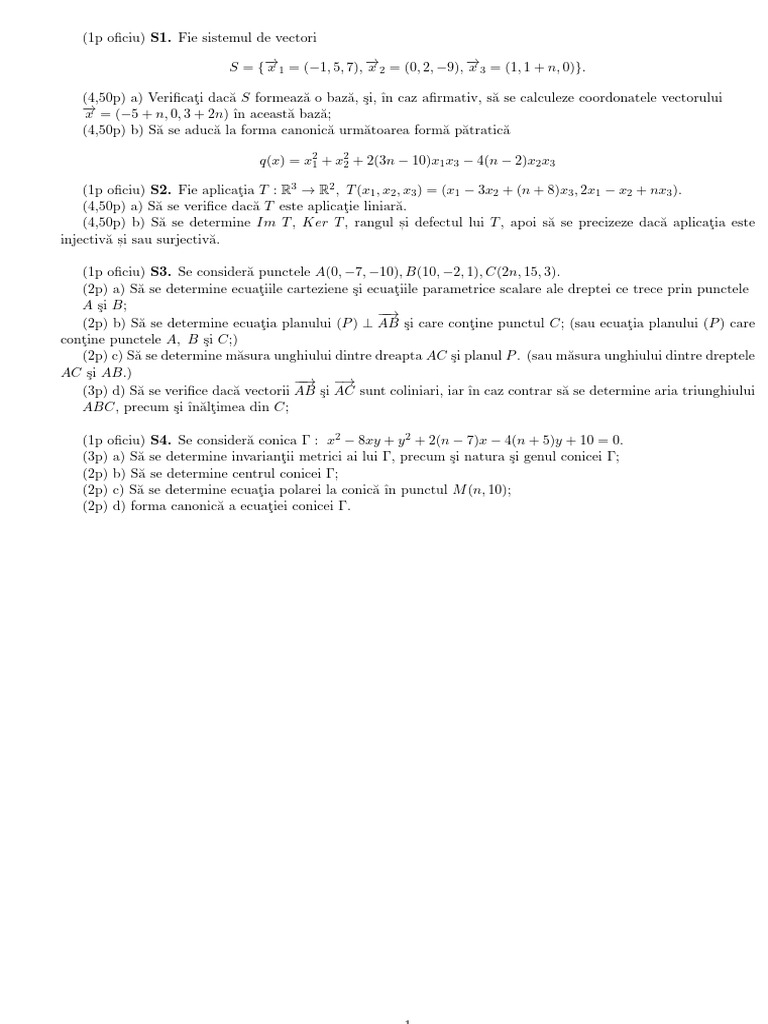 (1p oficiu) S2. Fie aplicaţia T : R3 → R2 , T (x1 , x2 , x3 ) = (x1 − 3x2 + (n + 8)x3 , 2x1 − x2 + nx3 ).