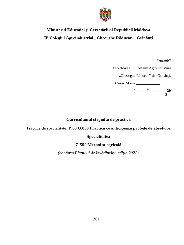 Practica de specialitate: P.08.O.056 Practica ce anticipează probele de absolvire