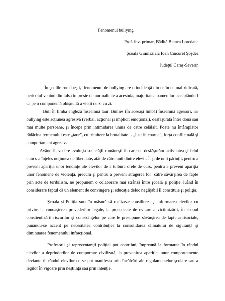 manifestare, cauze, efecte, statistici privind gradul de escaladare a fenomenului în școala