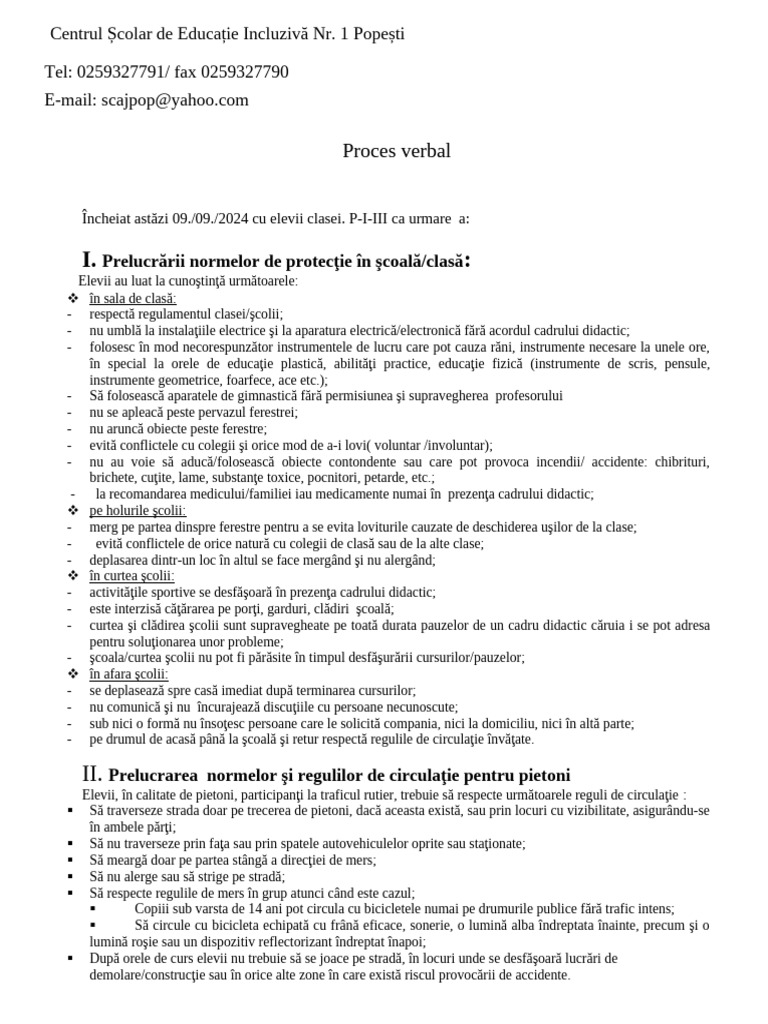 Încheiat astăzi 09./09./2024 cu elevii clasei. P-I-III ca urmare a: