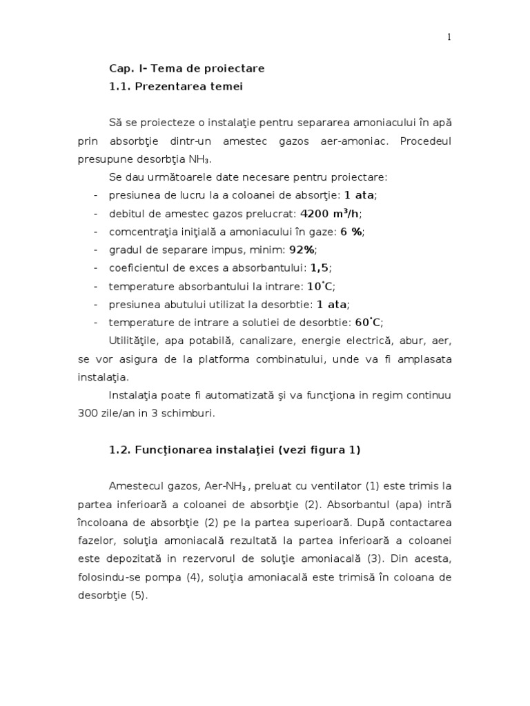 Prezentarea temei S se proiecteze o instalaie pentru separarea amoniacului n ap prin absorbie dintr-un amestec gazos aer-amoniac. Procedeul presupune desorbia NH3. Se dau urmtoarele date necesare pentru proiectare: presiunea de lucru la a coloanei de absorie: 1 ata; debitul de amestec gazos prelucrat: 4200 m3/h; comcentraia iniial a amoniacului n gaze: 6 %; gradul de separare impus, minim: 92%; coeficientul de exces a absorbantului: 1,5; temperature absorbantului la intrare: 10C; presiunea abutului utilizat la desorbtie: 1 ata; temperature de intrare a solutiei de desorbtie: 60C; Utilitile, apa potabil, canalizare, energie electric, abur, aer, se vor asigura de la platforma combinatului, unde va fi amplasata instalaia. Instalaia poate fi automatizat i va funciona in regim continuu 300 zile/an in 3 schimburi. 1.2. Funcionarea instalaiei (vezi figura 1) Amestecul gazos, Aer-NH3 , preluat cu ventilator (1) este trimis la partea inferioar a coloanei de absorbie (2). Absorbantul (apa) intr ncoloana de absorbie (2) pe la partea superioar. Dup contactarea fazelor, soluia amoniacal rezultat la partea inferioar a coloanei este depozitat in rezervorul de soluie amoniacal (3). Din acesta, folosindu-se pompa (4), soluia amoniacal este trimis n coloana de desorbie (5).