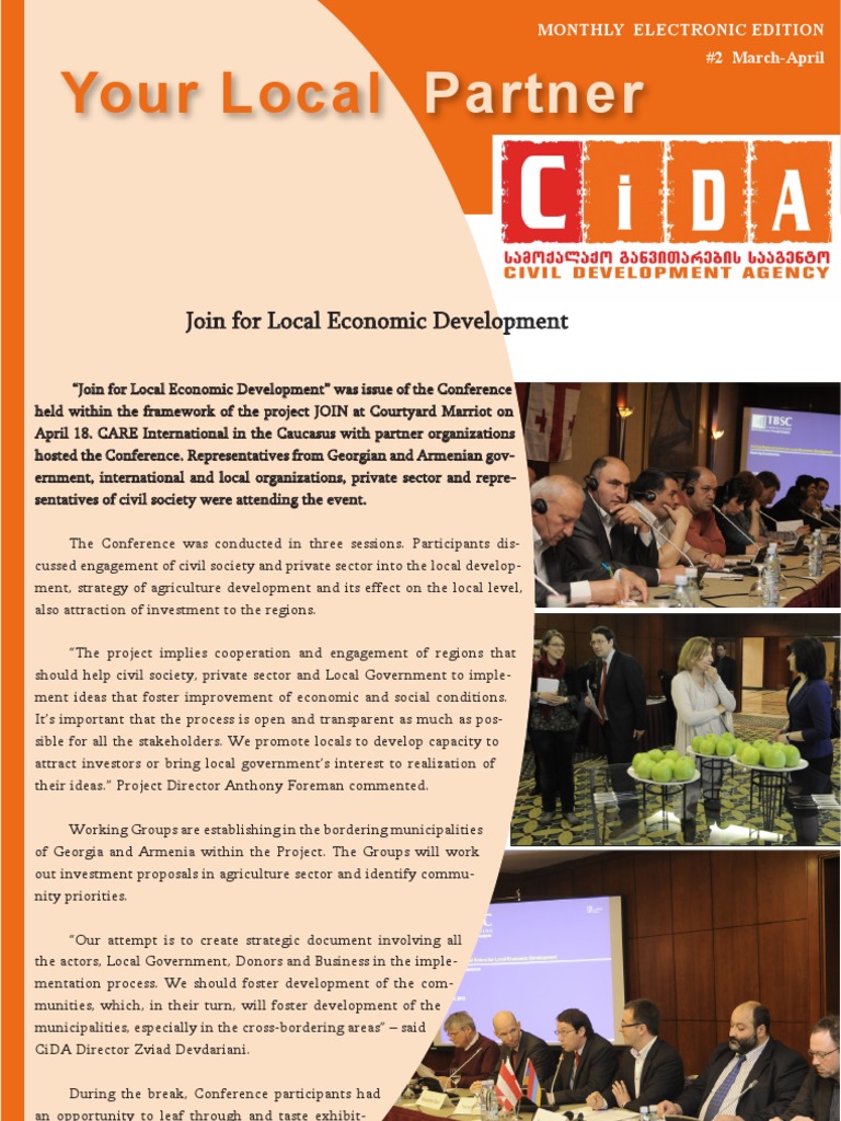 Lori regions, the project target areas. The representative of the project funder Austrian Development Cooperation in the East Caucasus Alexander Bohr also attended the conference. He welcomed transition of the project on the new stage and noted that the Agency proceeds supporting Georgia and Armenia, especially from the point of agriculture development. Project Local Actors Join for Inclusive Economic Development and Government in the South Caucasus (JOIN) is a 3-year initiative, funded by Austrian Development Agency. Project is implemented by CARE Austria and CARE International in the Caucasus with partner organizations: Civil Development Agency (CiDA) in Georgia and Agro-Business and Rural Development Centre (CARD) in Armenia.