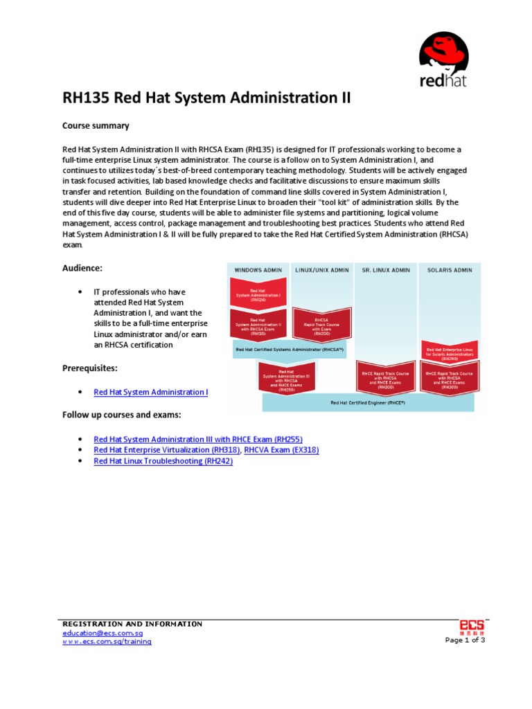 The following is an outline of the skills and knowledge represented in the training elements of the Red Hat System Administration II (RH135) Note: Technical content subject to change without notice. Reload this page regularly to insure up-to-date information.