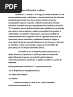 Exercitii corective pentru scolioza in C dreapta : 1. Mers prin sal, cu braul stng ridicat, braul drept n jos pe lng corp 2. Mers ghemuit (mersul piticului) cu minile sprijinite pe olduri i trunchiul meninutdrept pe vertical 3. Mers pe genunchi, cu sprijin pe palme, n cerc spre dreapta 4. Decubit ventral, cu braele ntinse deasupra capului, extensia trunchiului cu ridicarea braelor de pe sol i inspir; revenire cu expiraie 5. Sezand cu fata la oglinda: exercitiu de translatie, mutand trunchiul spre stanga, cumentinerea bratelor la orizontala 6. Decubit lateral drept, cu un sac de nisip sub torace, respiratie cu expansiuneahemitoracelui stang 7. eznd pe scaun cu greuti de 1 kg n mini; aplecarea trunchiului la 45 cu spatele nextensie, braele se duc n sus deasupra capului cu inspiraie i revenire n poziia de plecare cu expiraie 8. Atarnat cu fata spre scara fixa, apucat cu bratele la celasi nivel: ridicare MI inapoi inextensie, apoi revenire cu sprijinirea picioarelor pe o treapta 9. Stnd cu spatele la spalier i apucat de treapta de deasupra capului; ghemuirea ambelor MI n expir; coborrea i sprijinirea lor pe sol i inspiraie n pauz 10. Stand cu spatele la spalier: pasire cu un picior, trunchiul in extensie, iar bratele se duc prin fata sus pana ating scara; revenire, apoi se repeta cu pasire cu celalalt picior 11. Mers pe vrfuri cu o minge medicinal inut cu minile ntinse deasupra capului