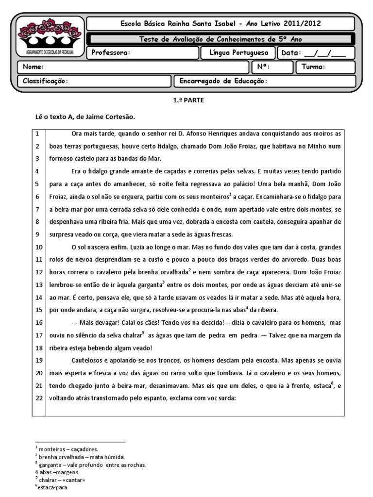 4. Completa as frases seguintes, assinalando com X a opo correta, de acordo com o texto. 4.1 A mulher marinha acordou devido(linha 28 e 31) a) ao grito dos homens que desciam a encosta. b) ao grito do homem que disse Chus! Calai-vos!. c) ao barulho de um ramo que estalou sobre os ps do cavaleiro Dom Froiaz. 4.2. A mulher marinha, ao ser apanhada, (linha 37 e 38) a) esbracejou e gritou, insultando o cavaleiro. b) esbracejou e no emitiu uma nica palavra de lamento. c) manteve-se imvel, deixando-se ser arrastada por Dom Froiaz. 5. A partir do texto fornece, caracteriza Dom Joo Froiaz atravs de dois adjetivos.