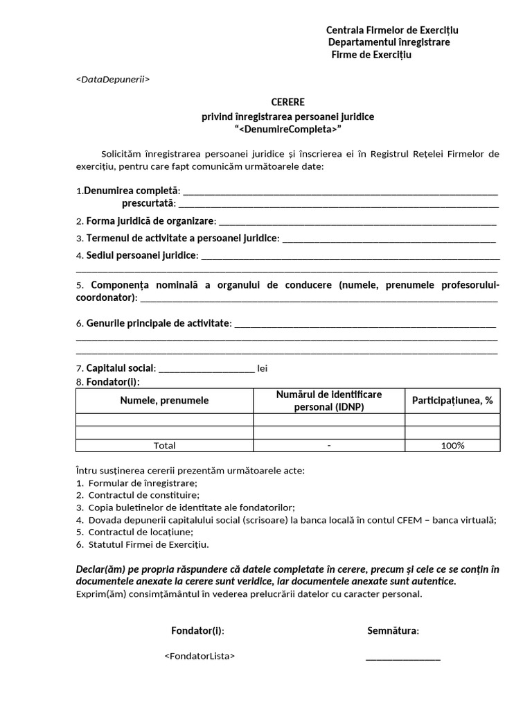 Solicităm înregistrarea persoanei juridice și înscrierea ei în Registrul Rețelei Firmelor de