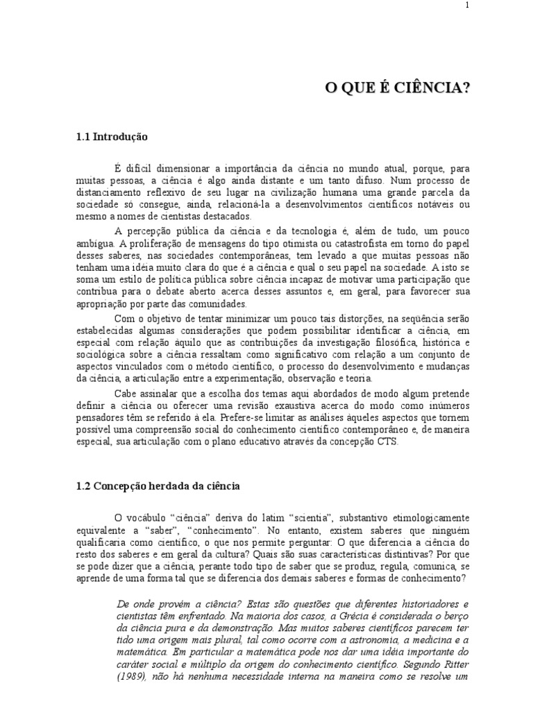 difcil dimensionar a importncia da cincia no mundo atual, porque, para muitas pessoas, a cincia algo ainda distante e um tanto difuso. Num processo de distanciamento reflexivo de seu lugar na civilizao humana uma grande parcela da sociedade s consegue, ainda, relacion-la a desenvolvimentos cientficos notveis ou mesmo a nomes de cientistas destacados. A percepo pblica da cincia e da tecnologia , alm de tudo, um pouco ambgua. A proliferao de mensagens do tipo otimista ou catastrofista em torno do papel desses saberes, nas sociedades contemporneas, tem levado a que muitas pessoas no tenham uma idia muito clara do que a cincia e qual o seu papel na sociedade. A isto se soma um estilo de poltica pblica sobre cincia incapaz de motivar uma participao que contribua para o debate aberto acerca desses assuntos e, em geral, para favorecer sua apropriao por parte das comunidades. Com o objetivo de tentar minimizar um pouco tais distores, na seqncia sero estabelecidas algumas consideraes que podem possibilitar identificar a cincia, em especial com relao quilo que as contribuies da investigao filosfica, histrica e sociolgica sobre a cincia ressaltam como significativo com relao a um conjunto de aspectos vinculados com o mtodo cientfico, o processo do desenvolvimento e mudanas da cincia, a articulao entre a experimentao, observao e teoria. Cabe assinalar que a escolha dos temas aqui abordados de modo algum pretende definir a cincia ou oferecer uma reviso exaustiva acerca do modo como inmeros pensadores tm se referido ela. Prefere-se limitar as anlises queles aspectos que tornem possvel uma compreenso social do conhecimento cientfico contemporneo e, de maneira especial, sua articulao com o plano educativo atravs da concepo CTS.