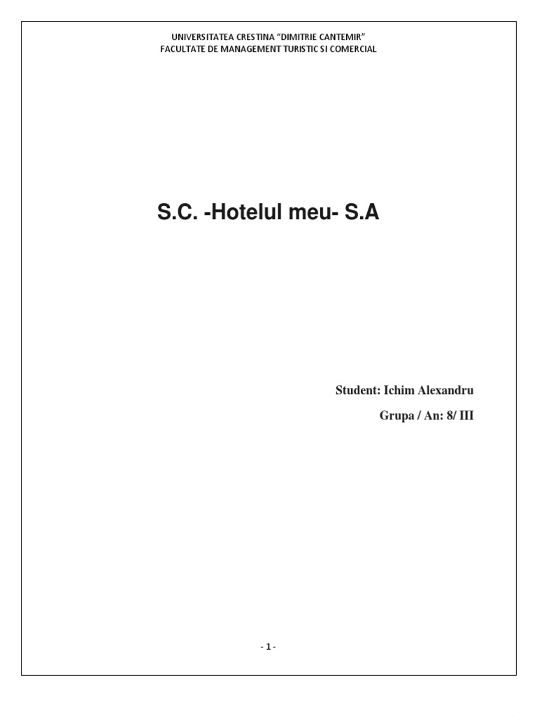 -conduce si coordoneaza intreaga activitate a hotelului. -intocmeste statistici si rapoarte specifice pentru managementul superior al grupului hotelier. 11. Responsabilitati si sarcini: Scopul postului: titularul postului are rolul de a asigura functionarea optima a hotelului. Activitati principale: -planificarea, organizarea, coordonarea, conducerea si controlul activitatilor hoteliere; -elaborarea strategiilor de dezvoltare a serviciilor specifice; -dezvoltarea si promovarea imaginii hotelului prin planificarea si coordonarea activitatilor de marketing si publicitate; -asigurarea unei bune promovari si vanzari de servicii hoteliere; -dezvoltarea relatiilor cu agentiile de turism; -supervizarea utilizarii corespunzatoare a metodelor de fidelizare a clientelei; -mobilizarea personalului din subordine in vederea mentinerii standardelor inalte ale serviciilor hoteliere oferite; -urmarirea solutionarii eficiente a solicitarilor clientilor. Sarcini si indatoriri specifice: -stabilirea unor relatii optime cu furnizorii, pentru rezolvarea in timp util si in bune conditii a tuturor problemelor ocazionale. -prospectarea pietei de profil in vederea optimizarii continue a serviciilor oferite, avand ca scop final realizarea obiectivelor asumate. Responsabilitati ale postului: -raspunde pentru calitatea activitatii personalului aflat in subordine si pentru fluxul operational la nivelul hotelului. 12. Sanctiuni pentru nerespectarea fisei postului sau a anexelor acestora: Sanctiunile aplicate pentru nerespectarea sarcinilor de serviciu conform rigorilor prevazute in fisa de post sunt descrise pe larg in Regulamentul intern (ROI). Serviciile de baz i suplimentare