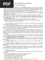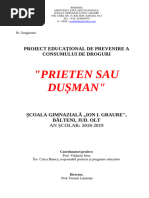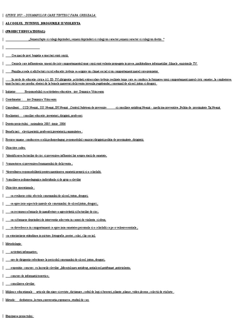 Etapizarea proiectului : -17 - 28 XI -informarea dirigintilor cu obiectivele acestei campanii , -2-19 XII -pregatirea materialelor pentru diriginti si sustinerea unor activitati despre sanatate si cultura medicala: *Alcoolul-medicament si otrava *Riscurile fumatului :fumatul in randul copiilor,parintii fumatori si sanatatea copiilor, repere de prevenire, sfaturi pentru copii si parinti; *Drogurile si SIDA ; *Violenta -cauze si urmari ; *,,Delicventa juvenila ,, - film video realizat la Scoala de corectie [Link] prezentat de Compartimentul de prevenire al IJP Neamt. -10 I - 30 IV -elaborarea materialelor de catre elevi: *realizarea unei anchete despre fumatul in scoala (profesori si elevi); *,,editarea,, unor pliante cu tema :campanie scolara anti . *compunerea de articole pentru revistele scolii:Mugurasii si Muguri de floare ; *realizarea de afise sugestive pentru riscurile consumului ; *propaganda si organizare de dezbateri pentru cunoasterea de catre elevi a riscurilor si pentru eliminarea lor din viata omului ; *justificarea proverbului ,, Betia este inceputul tuturor relelor,, *formularea unor sfaturi: ,,Daca prietenii tai incearca sa se drogheze ,cauta-ti alti prieteni !" ; ,,Un prieten adevarat nu te obliga sa faci ceea ce ti-ar putea dauna !" ,,Tutunul si saracia- un cerc vicios" ; "Daca fumezi, ca mine vei ajunge ! " -1- 30 V - organizarea unei expozitii cu lucrari ale elevilor intitulata,, Mesajul meu anti . concurs cu materiale publicitare ; *jurizarea lucrarilor si acordarea de premii ; *participarea elevilor la instruiri organizate de Centrul judetean de asistenta psihopedagogica Neamt ; *participarea elevilor si responsabililor proiectului ca voluntari la Campania stradala comunala: *18 noiembrie -Ziua Nationala fara Tutun ; *1 decembrie -Ziua Mondiala anti-SIDA; *7 aprilie -Ziua Mondiala a Sanatatii ; *31 mai _ Ziua Mondiala fara Tutun ; *26 iunie _Ziua Internationala de Lupta impotriva Traficului ilicit si a Consumului de Droguri ; *Sugestii pentru dezbateri in cadrul comisiilor metodice : ,,Valorificarea valentelor educative ale textelor literare cu continut etic si moral " Alte activitati cu caracter permanent : ,,10 minute de educatie civica zilnica "(valorificarea situatiilor concrete din cl. I-VIII ,mass-media, dezbaterea cazurilor de indisciplina); *colaborare cu prof . de religie , preot Mihai Vrinceanu- Parohia [Link] Raucesti; *intalniri cu reprezentanti ai Politiei Raucesti; Criterii de evaluare a proiectului: _relevanta problemei semnalate, _oportunitatea si aplicabilitatea informatiilor ; _continutul si calitatea activitatilor organizate . Evaluare: *Organizarea unei expozitii cu materiale publicitare ; *Caseta video si DVD cu momentele principale din cadrul proiectului;