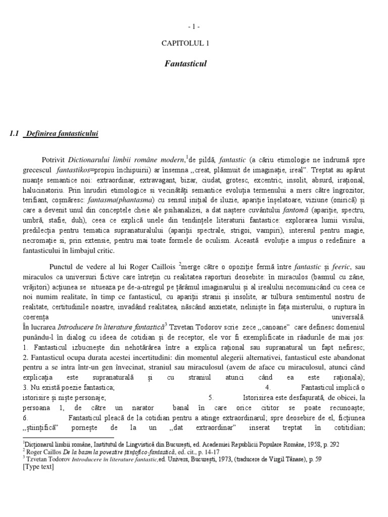Dicionarul limbii romne, Institutul de Lingvistic din Bucureti, ed. Academiei Republicii Populare Romne, 1958, p. 292 Roger Caillos De la basm la povestire tinofico-fantastic, ed. cit., p. 14-17 3 Tzvetan Todorov Introducere n literature fantastic,ed. Univers, Bucureti, 1973, (traducere de Virgil Tnase), p. 59