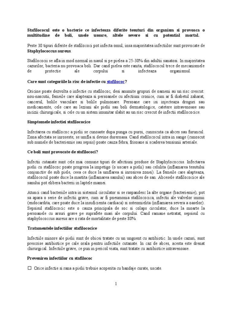 si cu potential mortal. Peste 30 tipuri diferite de stafilococi pot infecta omul, insa majoritatea infectiilor sunt provocate de Staphylococcus aureus. Stafilococii se afla in mod normal in nasul si pe pielea a 25-30% din adultii sanatosi. In majoritatea cazurilor, bacteria nu provoaca boli. Dar cand pielea este ranita, stafilococul trece de mecanismele de protectie ale corpului si infecteaza organismul. Care sunt categoriile la risc de infectie cu stafilococ? Oricine poate dezvolta o infectie cu stafilococ, desi anumite grupuri de oameni au un risc crescut: nou-nascutii, femeile care alapteaza si persoanele cu afectiuni cronice, cum ar fi diabetul zaharat, cancerul, bolile vasculare si bolile pulmonare. Persoane care isi injecteaza droguri sau medicamente, cele care au leziuni ale pielii sau boli dermatologice, catetere intravenoase sau incizii chirurgicale, si cele cu un sistem imunitar slabit au un risc crescut de infectii stafilococice. Simptomele infectiei stafilococice Infectarea cu stafilococ a pielii se cunoaste dupa punga cu puroi, cunoscuta ca abces sau furuncul. Zona afectata se inroseste, se umfla si devine dureroasa. Cand stafilococul intra in sange (cunoscut sub numele de bacteriemie sau sepsis) poate cauza febra, frisoane si scaderea tensiunii arteriale. Ce boli sunt provocate de stafilococi? Infectii cutanate sunt cele mai comune tipuri de afectiuni produse de Staphylococcus. Infectarea pielii cu stafilococ poate progresa la impetigo (o uscare a pielii) sau celulita (inflamarea tesutului conjunctiv de sub piele, ceea ce duce la umflarea si inrosirea zonei). La femeile care alapteaza, stafilococul poate duce la mastita (inflamarea sanului) sau abces de san. Abcesele stafilococice ale sanului pot elibera bacterii in laptele mamei. Atunci cand bacteriile intra in sistemul circulator si se raspandesc la alte organe (bacteriemie), pot sa apara o serie de infectii grave, cum ar fi pneumonia stafilococica, infectii ale valvelor inimii (endocardita, care poate duce la insuficienta cardiaca) si osteomielita (inflamarea severa a oaselor). Sepsisul stafilococic este o cauza principala de soc si colaps circulator, duce la moarte la persoanele cu arsuri grave pe suprafete mari ale corpului. Cand ramane netratat, sepsisul cu staphylococcus aureus are o rata de mortalitate de peste 80%. Tratamentele infectiilor stafilococice Infectiile minore ale pielii sunt de obicei tratate cu un unguent cu antibiotic. In unele cazuri, sunt prescrise antibiotice pe cale orala pentru infectiile cutanate. In caz de abces, acesta este drenat chirurgical. Infectiile grave, ce pun in pericol viata, sunt tratate cu antibiotice intravenoase. Prevenirea infectiilor cu stafilococ Orice infectie si rana a pielii trebuie acoperita cu bandaje curate, uscate. 1