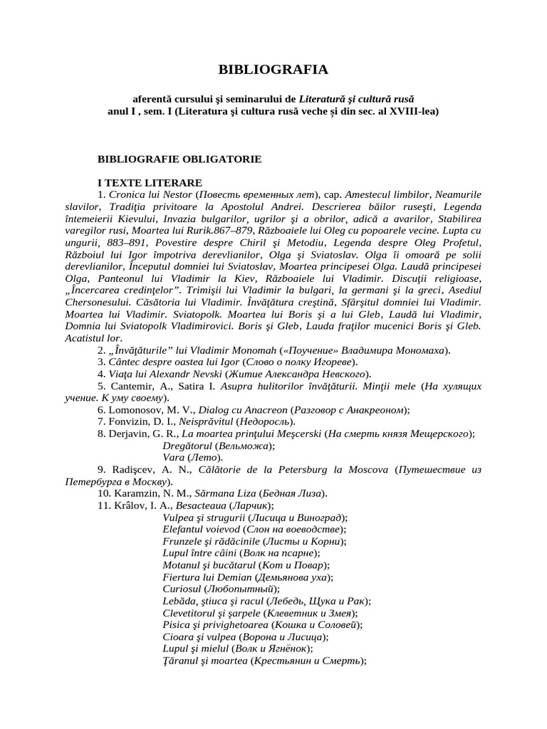 anul I , sem. I (Literatura şi cultura rusă veche și din sec. al XVIII-lea)