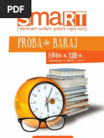 A) Alin B) Cosmin C) Cristian D) Marius E) Radu 12. Pentru a ajunge la caban, un turist mai are nevoie de 30 de minute. Acesta nseamn: A) o or B) dou ore C) un sfert de or D) o jumtate de or E) trei sferturi de or 13. Un ceas are ambele ace indicatoare n direcia numrului 12. Ora indicat este: A) 12 fr un sfert B) 12 C) 12 i 30 minute D) 12 i jumtate E) 12 i un sfert 14. Laura are cinci puculie. Fiecare conine una dintre sumele: 325, 422, 523, 624, 527 . Care sunt cele dou puculie, unde numerele au unitile ct suma dintre sute i zeci? A) 325, 422 B) 422, 523 C) 325, 527 D) 422, 624 E) 624, 527 15. Radu i Andrei au fiecare cte 100 lei. Primul i cumpr o carte de 30 lei, iar al doilea un joc de 20 lei. Restul lui Andrei, fa de al lui Radu, va fi: A) cu 10 lei mai mare B) cu 10 lei mai mic C) cu 20 lei mai mic D) egal cu al lui Radu E) cu 20 lei mai mare