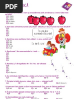 7. Cu ct este mai mare sfertul unui numr dect ptrimea sa? A) cu un sfert B) cu o ptrime C) cu o parte D) sunt egale E) cu o unitate 8. Ce numr trebuie sczut din 900 pentru a obine triplul numrului 6 ? A) 872 B) 882 C) 304 D) 892 E) 982 9. Eu sunt cel mai mare numr format din cinci cifre diferite i am cifra zecilor 6. Cine sunt ? A) 90 765 B) 98 765 C) 98 665 D) 97 865 E) 98 567 10. ntr-o cutie sunt 6 bomboane roii i 6 bomboane galbene. Cte bomboane trebuie s scoi pentru a fi sigur c ai scos cel puin o bomboan roie? A) 2 bomboane B) 4 bomboane C) 5 bomboane D) 7 bomboane E) 3 bomboane