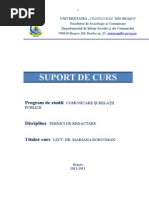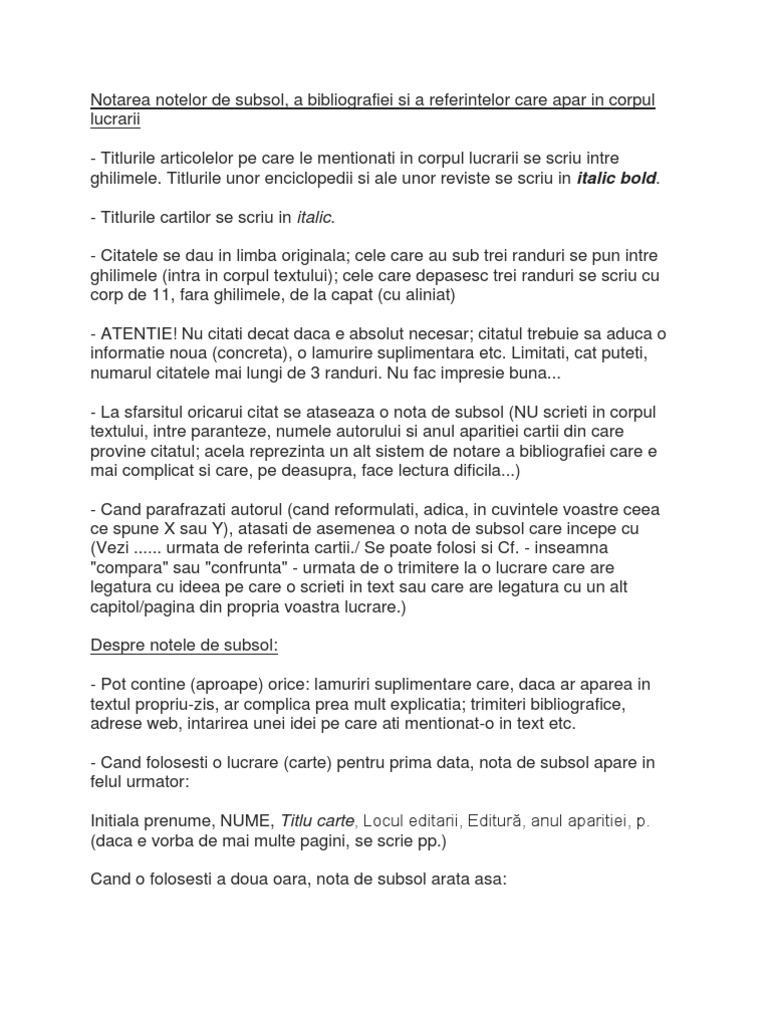 se scriu intre ghilimele. Titlurile unor enciclopedii si ale unor reviste se scriu in italic bold. - Titlurile cartilor se scriu in italic. - Citatele se dau in limba originala; cele care au sub trei randuri se pun intre ghilimele (intra in corpul textului); cele care depasesc trei randuri se scriu cu corp de 11, fara ghilimele, de la capat (cu aliniat) - ATENTIE! Nu citati decat daca e absolut necesar; citatul trebuie sa aduca o informatie noua (concreta), o lamurire suplimentara etc. Limitati, cat puteti, numarul citatele mai lungi de 3 randuri. Nu fac impresie buna... - La sfarsitul oricarui citat se ataseaza o nota de subsol (NU scrieti in corpul textului, intre paranteze, numele autorului si anul aparitiei cartii din care provine citatul; acela reprezinta un alt sistem de notare a bibliografiei care e mai complicat si care, pe deasupra, face lectura dificila...) - Cand parafrazati autorul (cand reformulati, adica, in cuvintele voastre ceea ce spune X sau Y), atasati de asemenea o nota de subsol care incepe cu (Vezi ...... urmata de referinta cartii./ Se poate folosi si Cf. - inseamna "compara" sau "confrunta" - urmata de o trimitere la o lucrare care are legatura cu ideea pe care o scrieti in text sau care are legatura cu un alt capitol/pagina din propria voastra lucrare.) Despre notele de subsol: - Pot contine (aproape) orice: lamuriri suplimentare care, daca ar aparea in textul propriu-zis, ar complica prea mult explicatia; trimiteri bibliografice, adrese web, intarirea unei idei pe care ati mentionat-o in text etc. - Cand folosesti o lucrare (carte) pentru prima data, nota de subsol apare in felul urmator: Initiala prenume, NUME, Titlu carte, Locul editarii, Editur, anul aparitiei, p. (daca e vorba de mai multe pagini, se scrie pp.) Cand o folosesti a doua oara, nota de subsol arata asa: