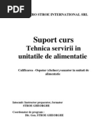 O dieta sanatoasa necesita un plan, un scop, precum si efortul de a include in mese o varietate de alimente. Majoritatea persoanelor nu consuma suficienti nutrienti deoarece nu includ in mese o cantitate corespunzatoare din fiecare grup alimentar. Deci, este important sa se acorde atentie nu numai la ce se consuma, dar si la ce anume se indeparteaza din dieta. Pentru aceasta ar fi recomandat elaborarea unui jurnal in care sa se noteze tot ce se consuma si se bea timp de o saptamana. Trebuie acordata atentie atat la cantitatea de alimente ingerata, cat si la grupele alimentare din care acestea fac parte. Nu este necesar sa se consume zilnic o cantitate minima de alimente din fiecare grup alimentar, ci sa se ingereze cantitatea recomandata de-a lungul unei saptamani. Cateva mici schimbari sunt suficiente pentru a echilibra dieta. In majoritatea cazurilor se elimina din alimentatie multi nutrienti importanti. Capitolul I ne prezinta activitatea restaurantelor si a unitatilor similare, o constituie intreaga productie si distributie de mancare si bauturi, respectiv, dupa caz, prepararea preparatelor culinare si a produselor de patiserie-cofetarie, aprovizionarea cu marfuri, consumul produselor pe loc sau in afara unitatilor, cat si crearea unei ambiante favorabile destinderii si recreerii clientilor. Capitolul II si capitolul III ne descrie tehnica servirii preparatelor lichide care este destinul nostru naional, zonal i global, i n acelai timp un delicios fel de mncare. Compoziia ei e identic cu cea a vieii publice i politice din zon: 80% ap, restul bucele tiate mici, plutind n devlmie. S-ar zice c ciorba e o construcie egalitarist,