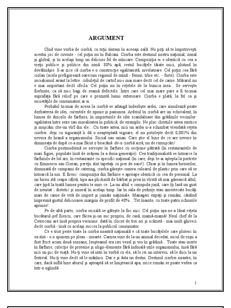 Cnd vine vorba de ciorb, cu toii sntem n aceeai oal. Nu poi s te mpotriveti acestui joc de cuvinte - cel puin nu n Balcani. Ciorba este destinul nostru naional, zonal i global, i n acelai timp un delicios fel de mncare. Compoziia ei e identic cu cea a vieii publice i politice din zon: 80% ap, restul bucele tiate mici, plutind n devlmie. S-ar zice c ciorba e o construcie egalitarist, nivelatoare. Cel puin cea fr ciolan (acela prefigureaz oarecum regimul de mn - femur, tibie etc. - forte). Ciorba este socialismul avant la lettre: cubuleul de cartof nu-i mai mare dect cel de carne. Mrarul nu e mai important dect sfecla. Cel puin nu n reetele de la bunica mea... Se servete fierbinte, ca s nu-i bagi de seam defectele. ntre care cel mai mare pare a fi tocmai suprafaa fr relief pe care o prezint lumii exterioare. Ciorba e plat, la fel ca i societile de consumatori ai ei. Probabil tocmai de aceea la ciorb se adaug ndeobte ardei, care simuleaz poate dezbaterea de idei, curentele de opinie i pasiunea. Ardeiul n ciorb are un echivalent, n lumea de dincolo de farfurie, n importurile de idei scandaloase din grdinile vecinilor: egalitatea ntre sexe sau moralitatea n politic, de exemplu. Ne plac chestiile astea exotice i mucm cte-un vrf din ele... Cu toate astea, nici un ardei n-a schimbat vreodat reeta ciorbei: dei cu siguran i d o neateptat vigoare, el nu potolete dect 0,001% din nevoia de hran a organismului. Social sau uman. Care tie el bine de ce are nevoie n dimineaa de dup ce-a mai fcut o boacn: de-o ciorb acr, nu de remucri! Ciorba postmodern se servete n farfurie cu seciune ptrat (n restaurantele de mari figuri, populate ns de oreni la a doua generaie). Cea tradiionalist se ntoarce la farfuriile de lut ars, n restaurante cu specific naional (n care, dei te-ai atepta la portrete cu Eminescu sau Cioran, pereii snt tapetai cu piei de oaie!). Chiar i n lumea birourilor, dominat de companii de catering, ciorba gsete cumva culoarul de plastic prin care s se ntoarc la noi. E firesc: compoziia din farfurie e aproape identic cu cea de personal. La un birou st ceapa clit, tipa aia plictisit de brbat i prea n vrst s mai gseasc altul, care ip la toat lumea pentru te miri ce. La un altul e conopida jun, care i las un gust de neuitat - dietetic i imoral n acelai timp. Iar n sala de edine stau amestecate buci mari de carne de vit de import i jumri naionale. Manageri expai i romni, cutnd mpreun gustul delicioasei margini de profit de 40%... Tot nainte, cu toate patru ochiurile aprinse! Pe de alt parte, ciorba social se gtete la foc mic. Cel puin aa ne-a lsat reeta buctarul-ef Iliescu, care fcea i-un suc propriu, de cas, mam-mam! Noul chef de la Cotroceni are ns propria versiune: dat n clocot de trei ori i sczut - mai mult ghiveci dect ciorb - ns cu acelai succes la publicul consumator. Ce e trist peste toate la ciorba noastr naional e c toate bucelele care plutesc n ea snt - s-o spunem pe leau - moarte. Carnea vine de la un animal decedat, sucul de roii a fost fruct acum dou sezoane, leuteanul era ieri vesel i viu n grdin... Toate stau inerte n farfurie, colecie de proteine i oligo-elemente fr ndoial utile organismului, ns fr nici un pic de via. Nu-i vine s intri n vorb cu ele, s le iei un interviu, s le duci la un festival. Nu-i vine dect s le mnnci. Dar e i sta un destin. Destinul ciorbei noastre, n care, dac sufl bine aburul i ateapt s se liniteasc apa, orice romn se poate vedea ca ntr-o oglind 1