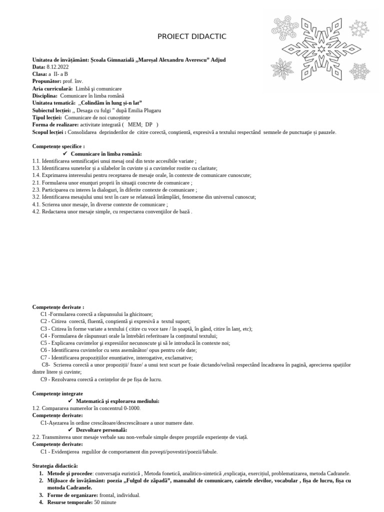 2. Mijloace de învãțãmânt: poezia ,,Fulgul de zãpadã”, manualul de comunicare, caietele elevilor, vocabular , fișa de lucru, fișa cu